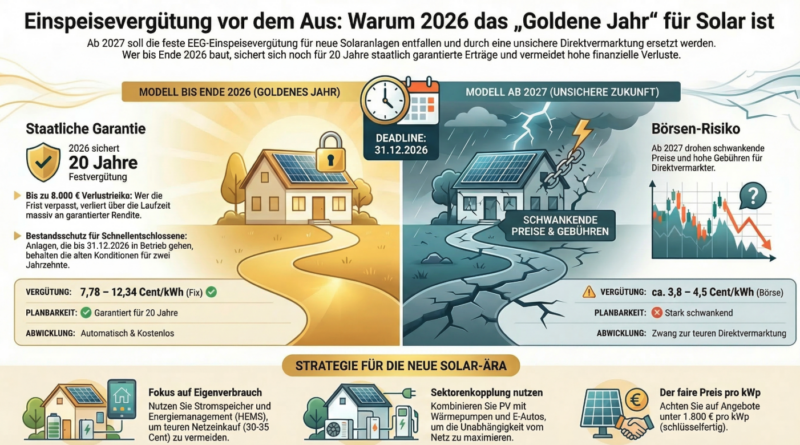 🚀 Das Wichtigste in Kürze Ende der Garantie: Ab 2027 soll die feste EEG-Einspeisevergütung für neu installierte PV-Anlagen komplett entfallen.