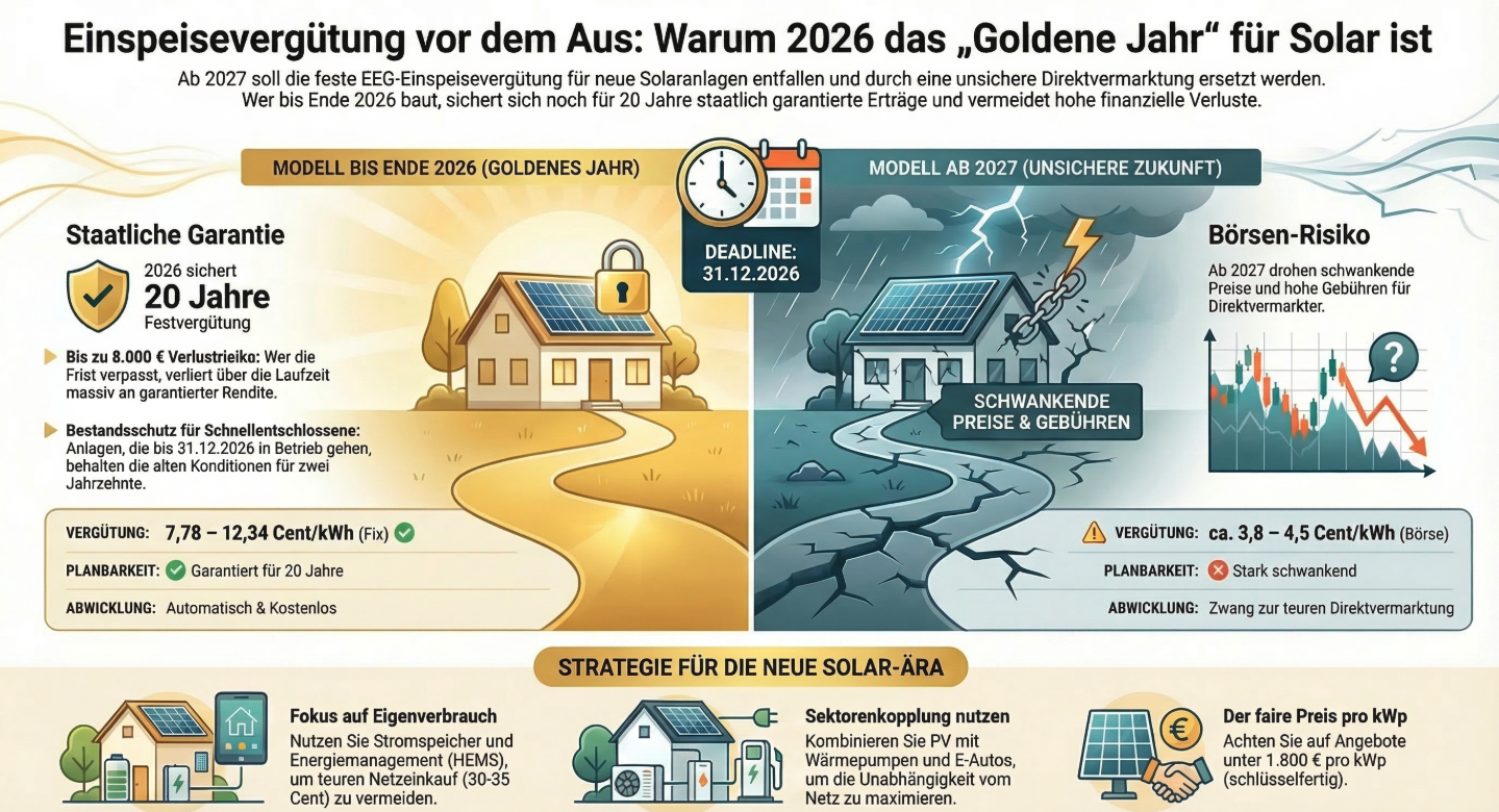 Wer hingegen auf 2027 oder auf vage, komplexe neue Fördermodelle der Politik wartet, geht ein hohes Risiko ein. Sobald die breite Masse der Hausbesitzer realisiert, dass die garantierte Vergütung wegfällt, droht in der zweiten Jahreshälfte 2026 ein massiver „Run“ auf die Solarteure – mit potenziell steigenden Preisen und monatelangen Wartezeiten als Folge. Unser Rat: Handeln Sie antizyklisch und holen Sie sich jetzt in Ruhe Ihre Angebote ein.