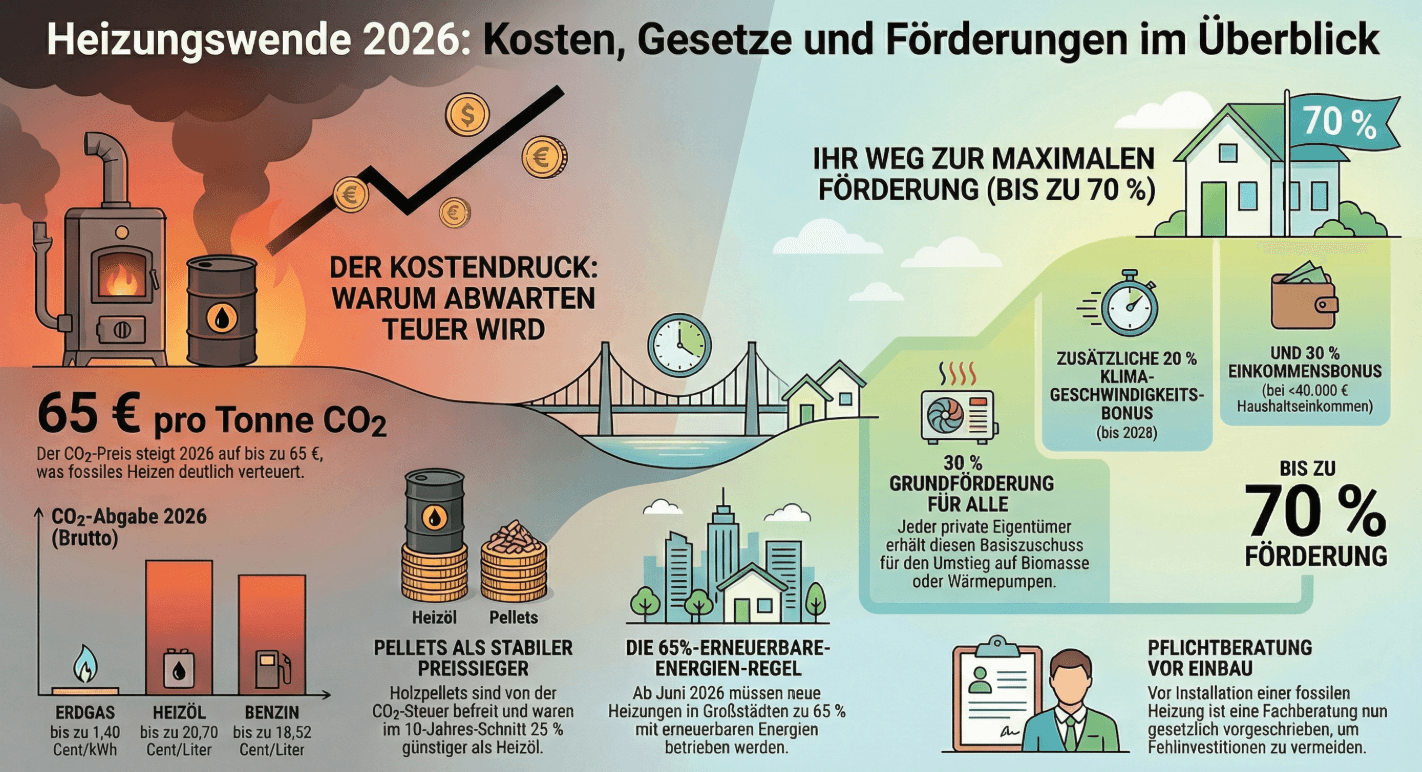 Der CO₂-Preis bewegt sich 2026 in einem Korridor von 55 bis 65 Euro pro Tonne. Das ist ein erheblicher Anstieg gegenüber den Vorjahren und macht sich direkt in Ihren Heizkosten bemerkbar: Wer mit Heizöl oder Erdgas heizt, zahlt pro Liter bzw. pro Kubikmeter mehr – und dieser Trend wird sich fortsetzen.