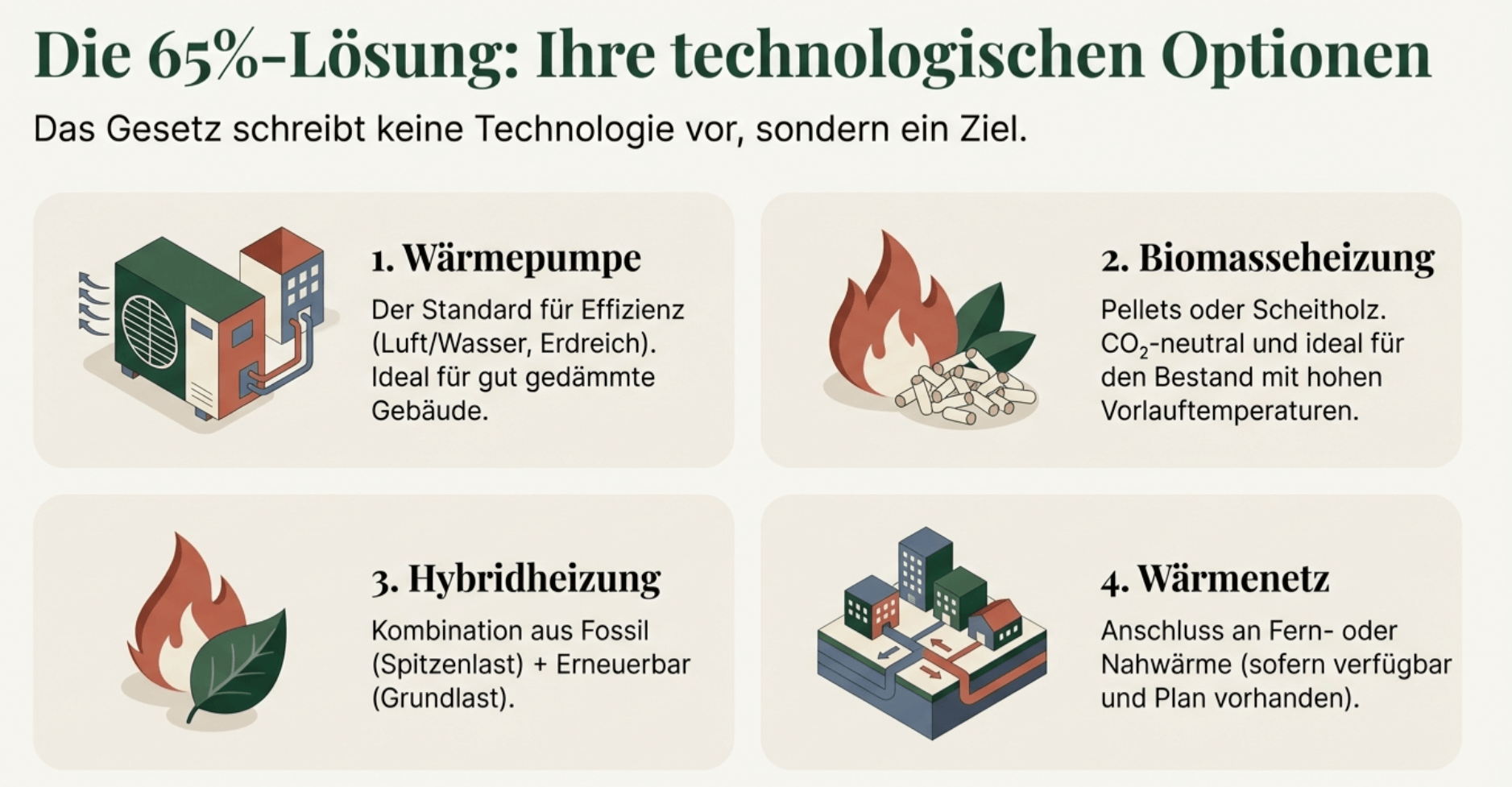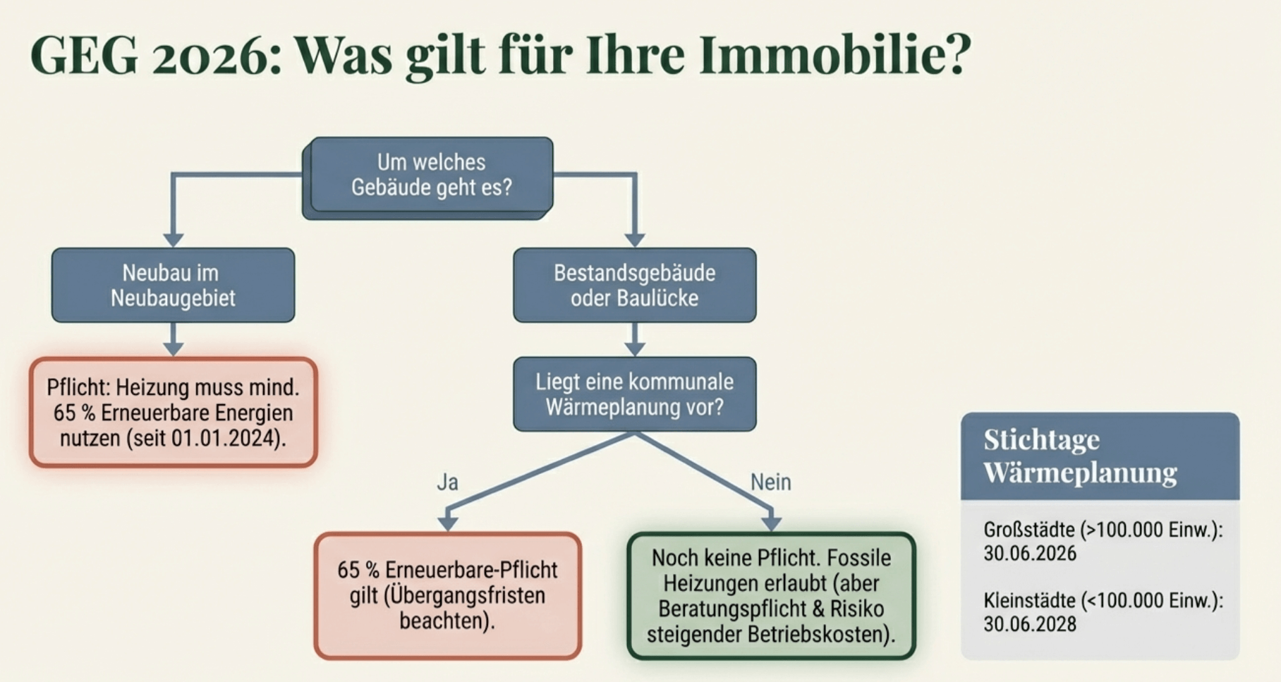 Tipp: Warten Sie auf Ihren kommunalen Wärmeplan (Großstädte bis 30. Juni 2026), bevor Sie entscheiden – er kann Ihre Optionen erheblich beeinflussen.