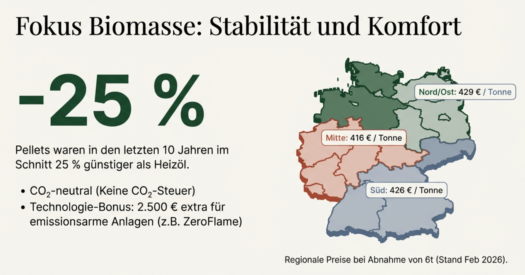 - Klimaneutral und zukunftssicher: Holzpellets gelten als CO₂-neutral – die Anlage unterliegt keinen künftigen Bio-Treppe-Auflagen wie eine Gasheizung.