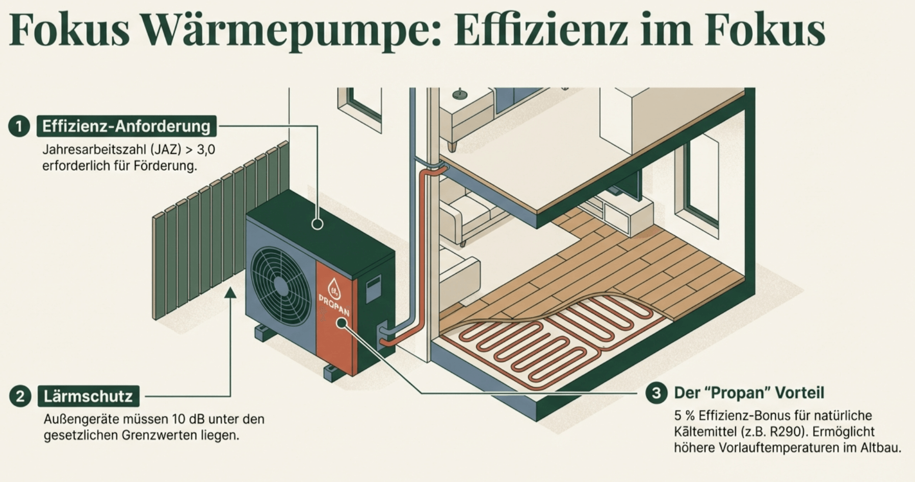 - Das neue Lärmschutz-Kriterium (10 dB unter EU-Grenzwert) muss bei der Geräteauswahl beachtet werden, wenn man Förderung beanspruchen möchte.