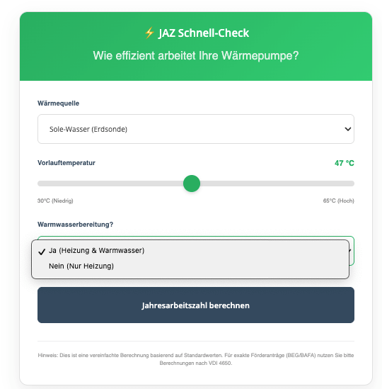 Offizieller JAZ-Rechner nach VDI 4650 für Förderanträge. - ➤Verbraucherzentrale