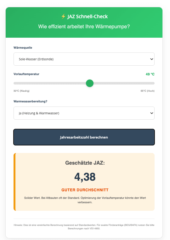 - ✔Grün (JAZ > 4,5): Exzellent. Sehr geringe Stromkosten, hohe Förderchancen.