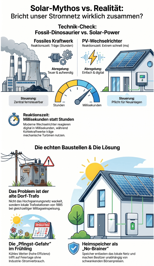 Die Tabelle entlarvt den größten Mythos der Energiewende: Solaranlagen seien „stur“ und würden das Netz verstopfen. Das Gegenteil ist der Fall. Deine PV-Anlage besteht nicht aus riesigen rotierenden Stahlmassen, sondern aus reiner Leistungselektronik. Wenn im Netz zu viel Strom schwimmt, lässt sich dein intelligenter Wechselrichter in Millisekunden drosseln – und zwar schneller, als du das Formular für den Netzanschluss falsch ausfüllen kannst.