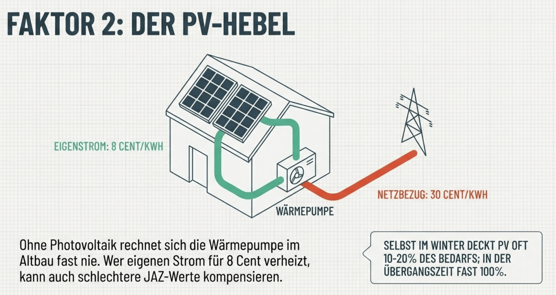 - Der „Hidden Champion“: Ohne eigene Photovoltaik-Anlage rechnet sich die Wärmepumpe im Altbau fast nie. Mit PV sieht die Rechnung komplett anders aus.