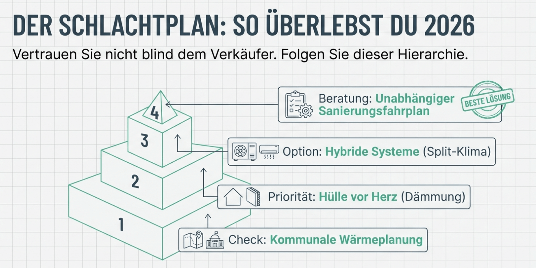 - Gesetz & Fristen: Bevor du handelst, prüfe die „Kommunale Wärmeplanung“ deiner Gemeinde – oft gibt es noch Schonfristen.