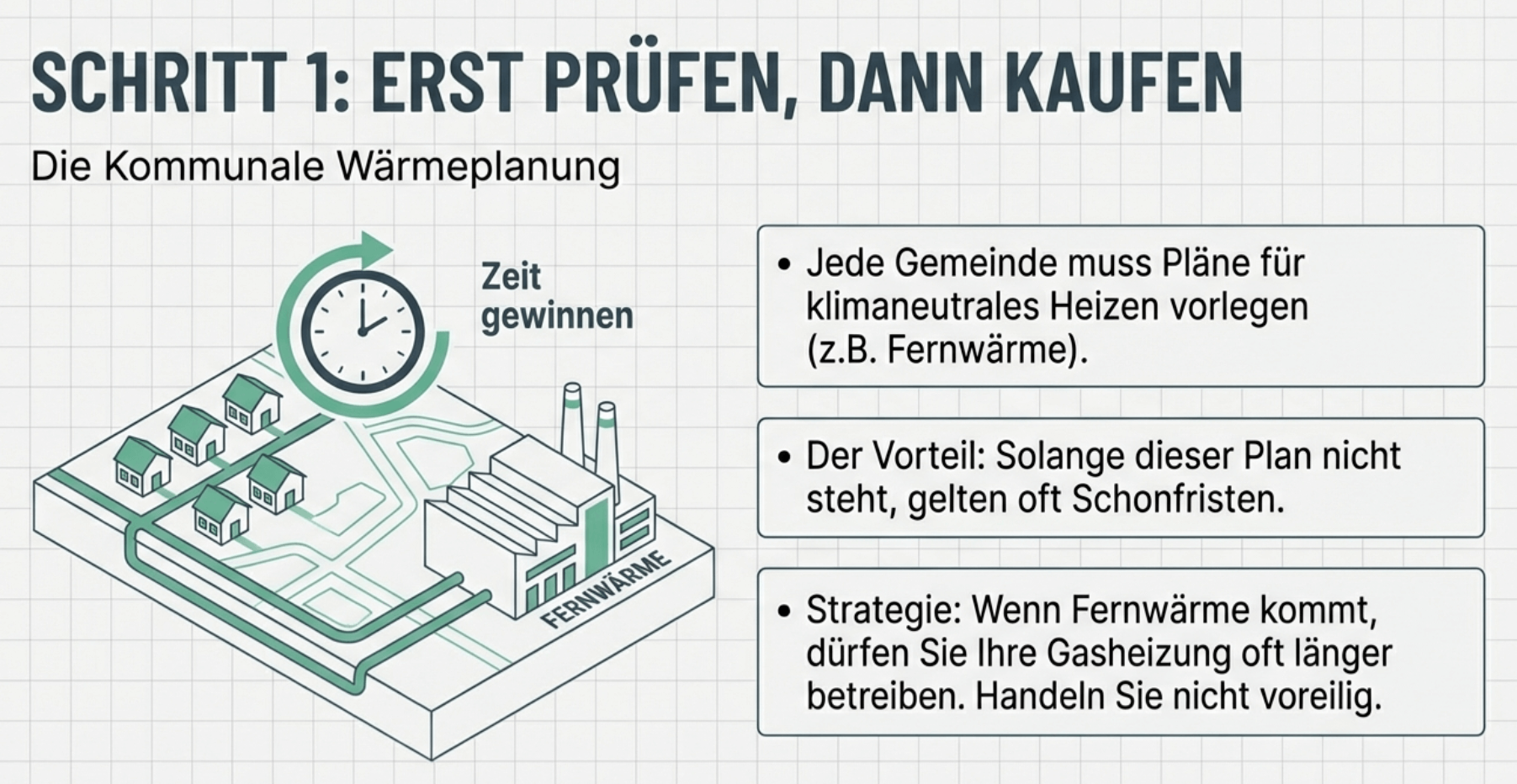 Jede Gemeinde muss Pläne vorlegen, wie sie klimaneutral heizen will (z.B. Fernwärme oder Wasserstoffnetze). Solange dieser Plan in deiner Stadt nicht steht, gelten beim Heizungstausch oft lockerere Übergangsfristen für Gasheizungen.