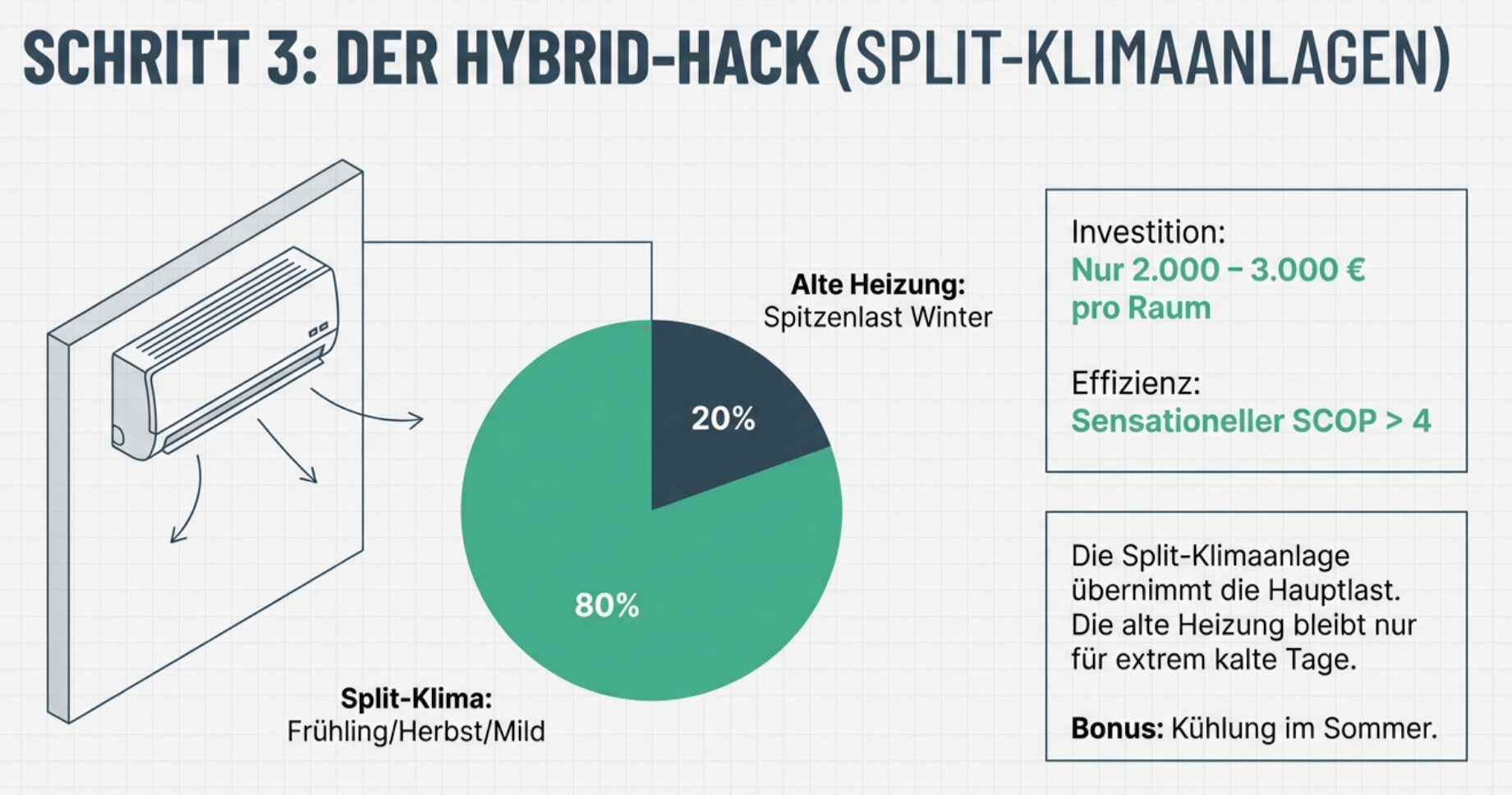 - Hybride Systeme: Überlege dir Split-Klimaanlagen. Diese kosten oft nur 2.000 – 3.000 € pro Raum, haben eine sensationelle Effizienz (SCOP > 4) und können 80% des Jahres heizen. Die alte Heizung bleibt für die extrem kalten Tage (Spitzenlast).